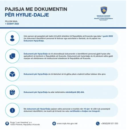 “Bazuar në vendimin e Qeverisë nga mbledhja e 85 e saj, ju rikujtojmë se nga data 1 gusht 2022, çdo person që paraqitet për kalim të kufirit shtetëror të Republikës së Kosovës me dokument identifikimi personal të lëshuar nga autoritetet e Serbisë do të pajiset me Dokument Hyrje/Dalje”, thuhet në deklaratë.