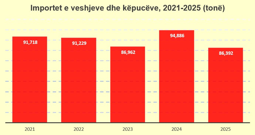 Sipas të dhënave zyrtare te INSTAT importet e veshjeve dhe këpucëve shënuan 86,4 mijë tonë në 2025, me ulje 9% në raport me vitin 2024.