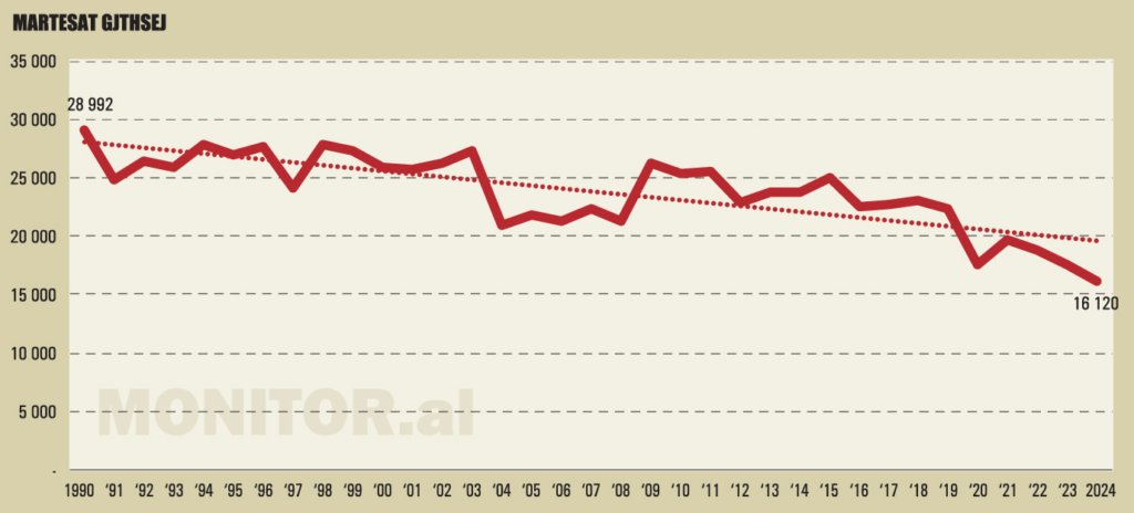 Viti 2024 shënon minimumin historik me vetëm 16 120 martesa, gati gjysma e nivelit të fillimit të viteve ’90, duke reflektuar jo thjesht një efekt demografik apo ekonomik, por një ndryshim të thellë në zgjedhjet sociale, emigracionin e të rinjve dhe hezitimin gjithnjë e më të madh për të formalizuar lidhjet në martesë.
