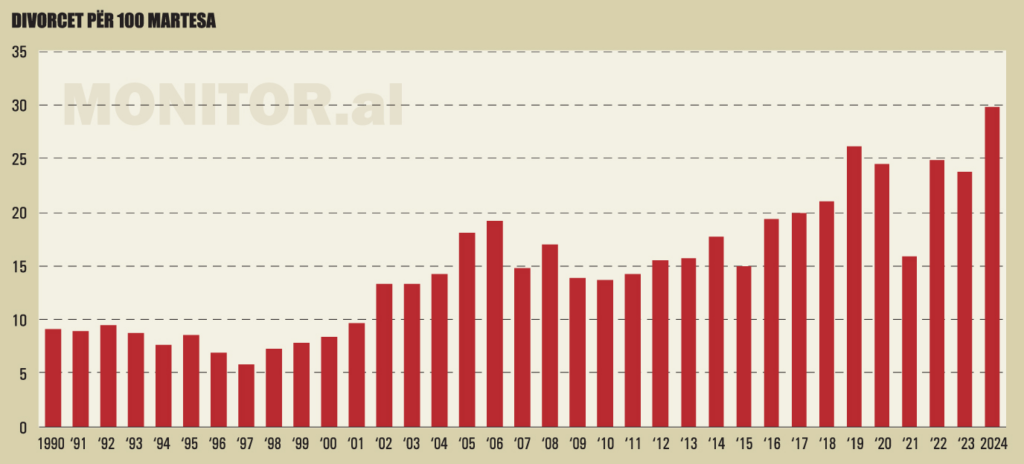 Nga fundi i viteve ’90, kur treguesi zbriti në minimumin historik prej 5.9 në vitin 1997, divorci nisi një ngjitje të pandalshme gjatë viteve 2000 dhe 2010, duke kaluar mbi 20 ndarje për 1 000 martesa që pas vitit 2018.Raportimi më i fundit tregon se viti 2024 shënon një rekord absolut prej 29.8 divorceve për 1 000 martesa, niveli më i lartë i regjistruar ndonjëherë në vend.