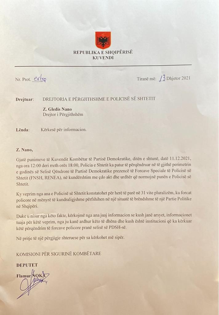 Shkresa që mban firmën e deputetit, Flamur Noka, thotë se është konstatuar për herë të parë në 31 vite pluralizëm që forcat policore në mënyrë të kundraligjshme janë përfshirë në situatën e brendshme të një partie politike.