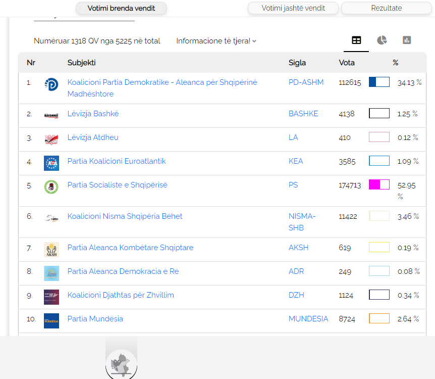 PS kryeson me 174,713 vota, ndërsa PD-ASHM ka marrë 112,615 vota për momentin. Forcë e tretë e ndjek PSD e Tom Doshit me 12,368 vota dhe më pas vjen e katërta, Shqipëria Bëhet e Adriatik Lapajt me 11,422 vota.