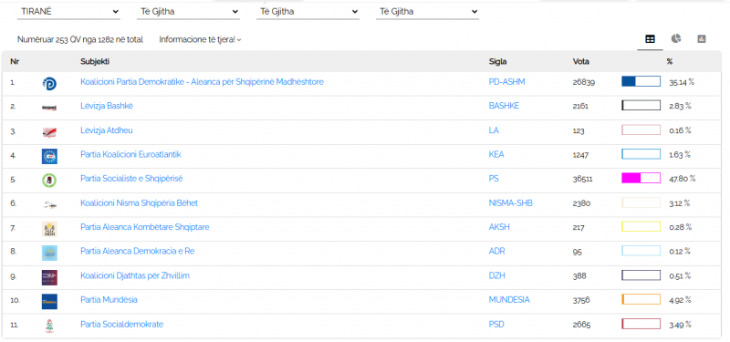 Deri tani PS ka grumbulluar 36511 vota, PD 26839, Mundësia 3189 vota, PSD 2665 vota, Lëvizja Bashkë 2161 vota, Shqipëria Bëhet 2380 vota.