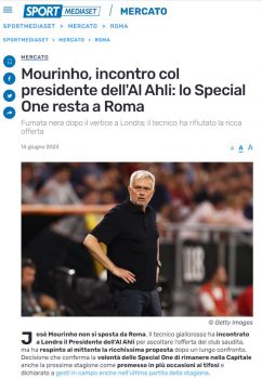 Pavarësisht përpjekjeve dhe shumave të çmendura, Mourinho i komunikoi presidentit të Al Ahli vendimin e tij, dëshirën për të vijuar në krye të Romës.Ideja e tekniku portugez është e qartë, kërkon të respektojë kontratën e tij me verdhekuqtë, do të mbajë fjalën që i dha tifozëve dhe lojtarëve.