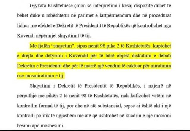 Me vendimin nr. 6, datë 18.01.2002, Gjykata Kushtetuese — autoriteti i vetëm kompetent për interpretimin e Kushtetutës — ka sanksionuar se Kuvendi ka të drejtën dhe detyrimin t’ia nënshtrojë debatit parlamentar dekretet e Presidentit për emërim/shkarkim ministrash (foto). Edi Rama dhe vartësit e tij, në shkelje të nenit 98, pika 2 të Kushtetutës dhe nenit 110, pika 4 të Rregullores së Kuvendit, vendosën sot të mos lejojnë zhvillimin e debatit, për t’iu shmangur përgjegjësisë dhe llogaridhënies. Shteti i së drejtës dhe demokracia në pikëpyetje!