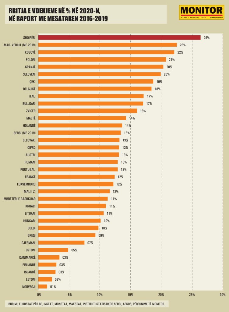 Të dhënat nga Eurostat, INSTAT dhe institutet statistikore të rajonit, të përpunuar nga Monitor, tregojnë se në vitin 2020, Shqipëria shënoi rritjen më lartë të vdekjeve në Europë, në krahasim me mesataren e 2016-2019.