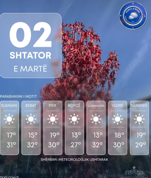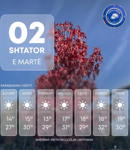 Dita e sotme do të karakterizohet nga kushte atmosferike të qëndrueshme në të gjithë territorin e vendit, duke sjellë mot të kthjellët dhe pa reshje shiu.