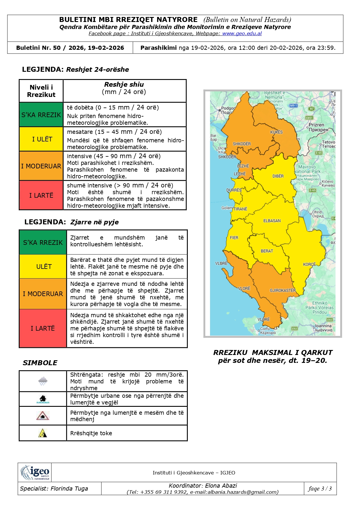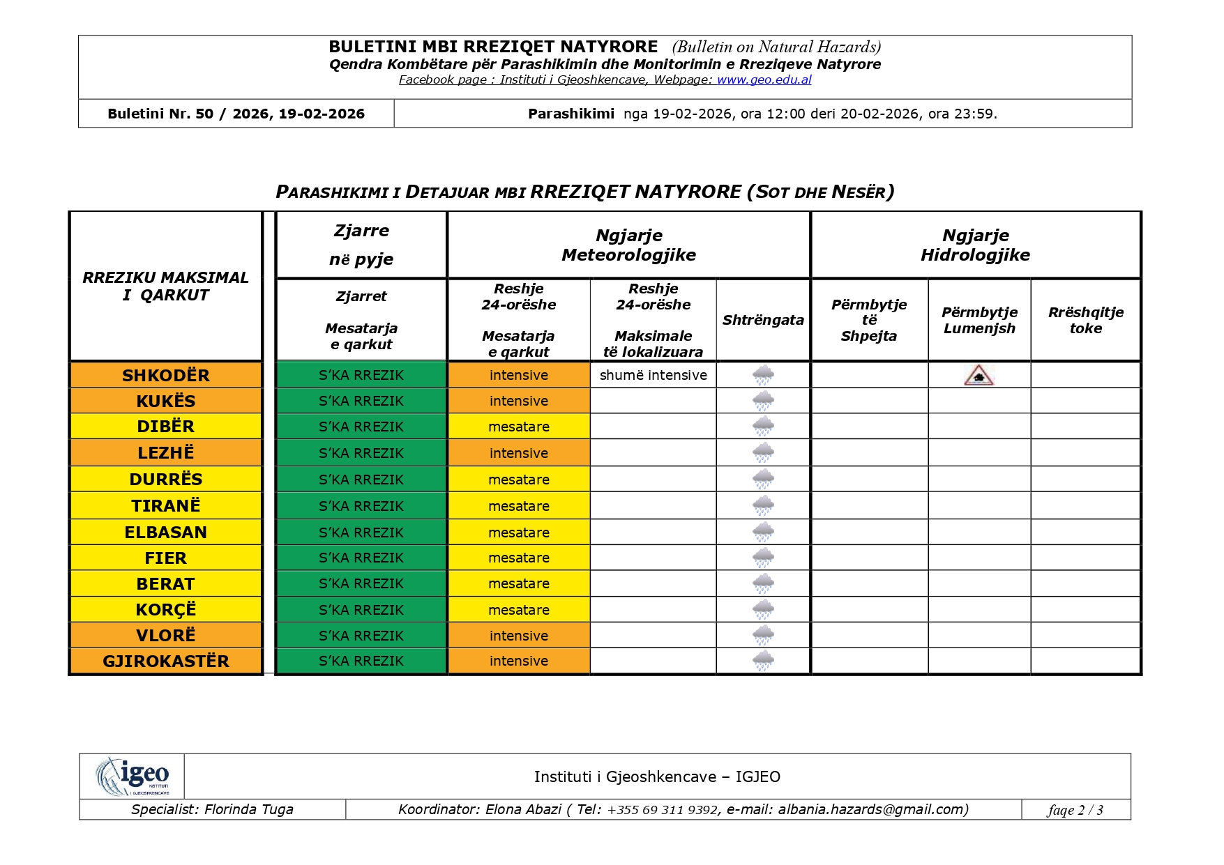Instituti i Gjeoshkencave ka ngritur alarmin portokalli, për pesë qarqe, Shkodër, Lezhë, Kukës, Vlorë dhe Gjirokastër.