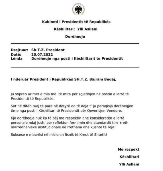 Begaj është informuar se ditën e sotme ka paraqitur dorëheqjen edhe Këshilltari i Presidentit, Ylli Asllani.