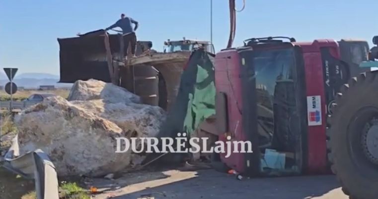 Një kamion i ngarkuar me gurë të mëdhenj është përmbysur në rrugë në zonën e Porto Romanos në Durrës.