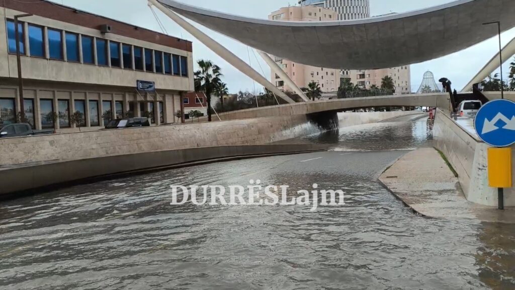 Nënkalimi pranë portit është përmbytur nga uji dhe Policia Bashkiake ka rrethuar zonën me shirita sigurie për të ndaluar qarkullimin e mjeteve.