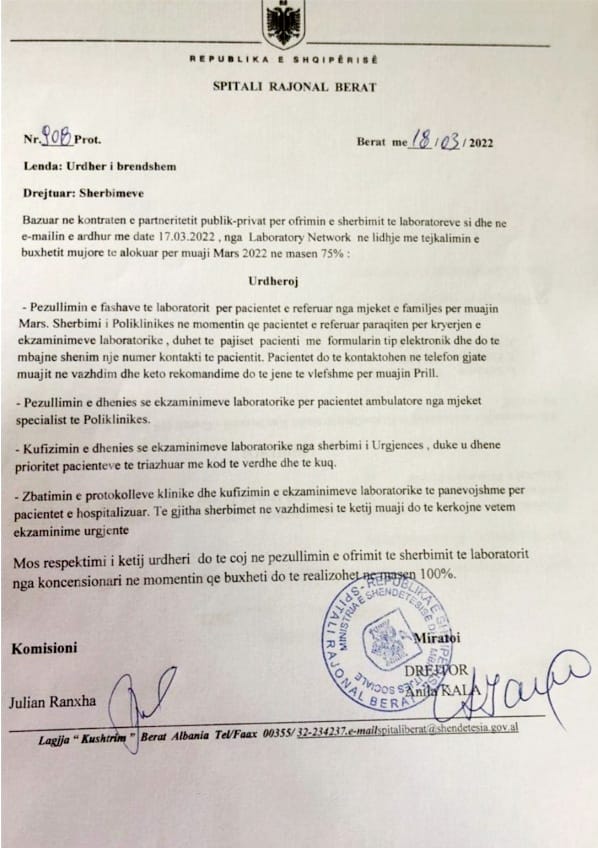 I drejtohet mjekëve të familjes dhe poliklinikave si dhe spitaleve ku u kërkohet të pezullojnë analizat për pacientët për pjesën e mbetur të muajit mars.