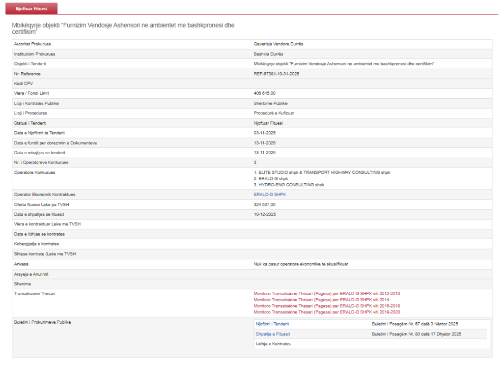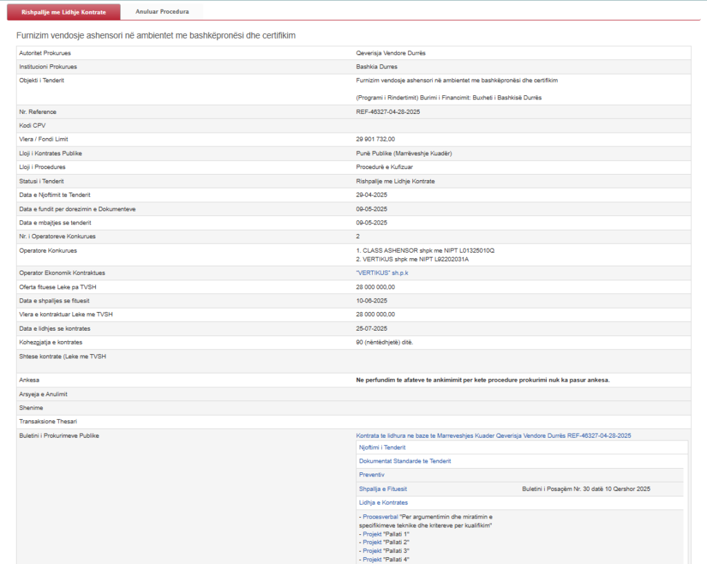 Përmes këtij tenderi me vlerë 28 milionë lekë do të vendosen 9 ashensorë në 4 pallate të dëmtuara nga tërmeti.