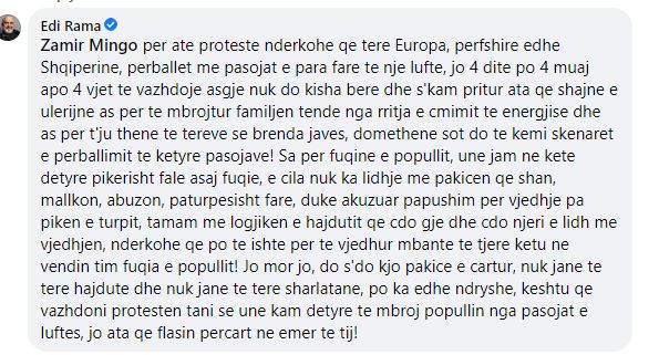“Per ate proteste nderkohe qe tere Europa, perfshire edhe Shqiperine, perballet me pasojat e para fare te nje lufte, jo 4 dite po 4 muaj apo 4 vjet te vazhdoje asgje nuk do kisha bere dhe s’kam pritur ata qe shajne e ulerijne as per te mbrojtur familjen tende nga rritja e cmimit te energjise dhe as per t’ju thene te tereve se brenda javes, domethene sot do te kemi skenaret e perballimit te ketyre pasojave!