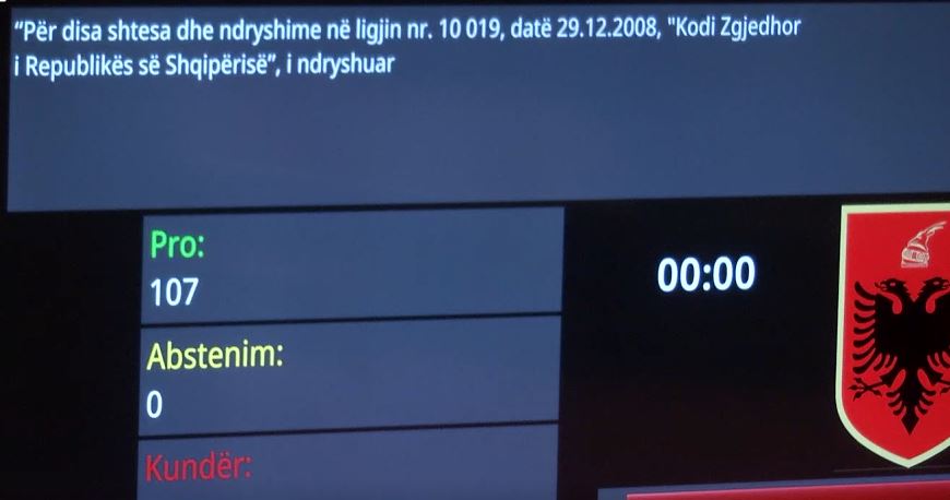 “107 vota pro elektronike, 1 votë pro me karton. 108 vota pro, 0 abstenim dhe 0 vota kundër. Hyn në fuqi ligji pas miratimit në Kuvend”, tha kryetarja e Kuvendit Elisa Spiropali.