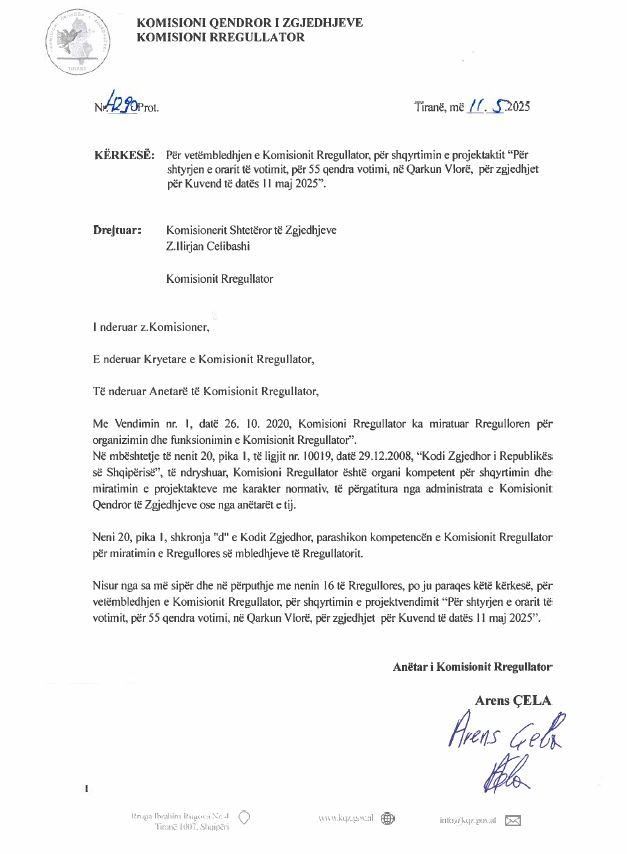 Kërkesa për vetëmbledhjen e Komisionit Rregullator është bërë nga Arens Çela.