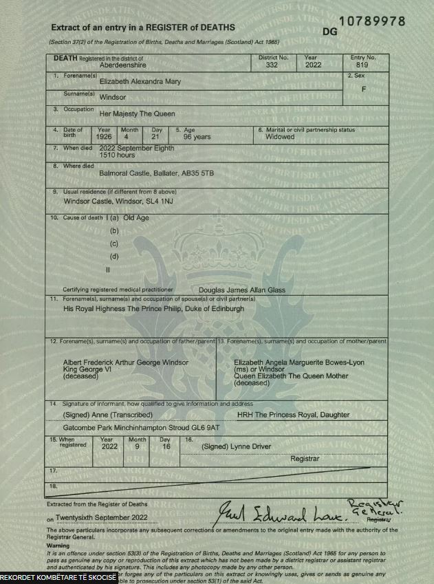 Më shumë se dy javë pasi ndërroi jetë, është publikuar certifikata e vdekjes e Mbretëreshës Elizabeth II.