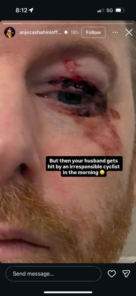 Përmes një Instastory, ajo publikoi një foto të bashkëshortit të saj, i cili dukej me sy të dëmtuar dhe i përgjakur, pas një aksidenti të ndodhur në orët e para të mëngjesit.