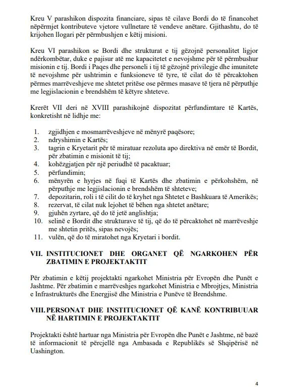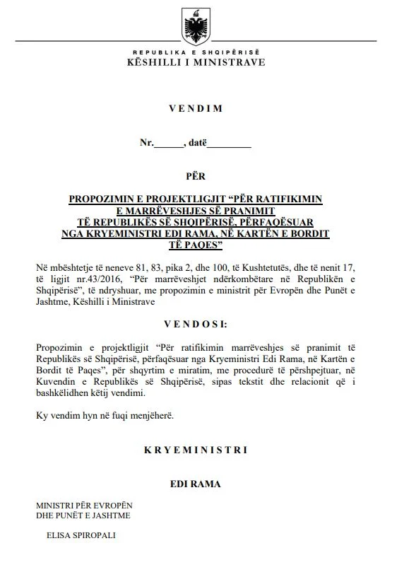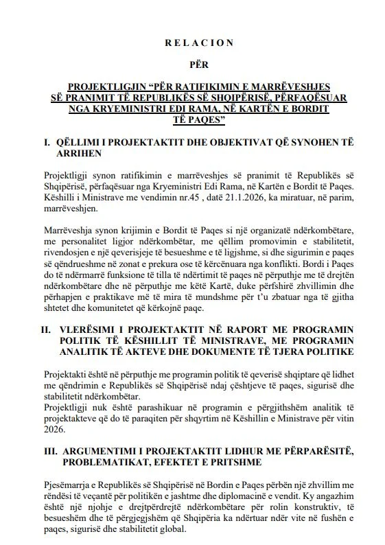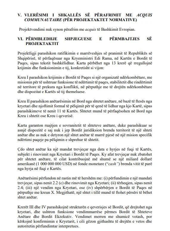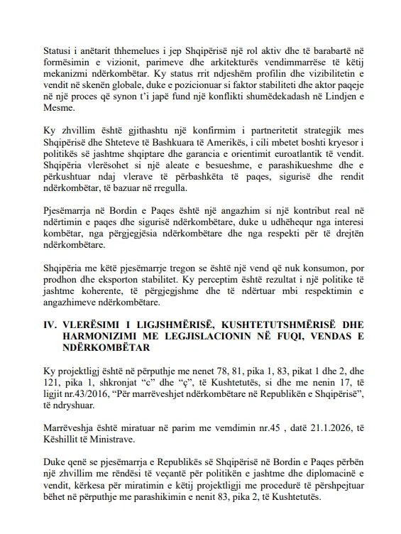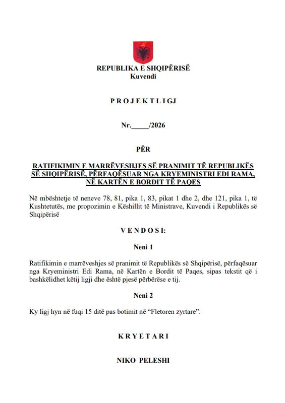 Sipas dokumentit zyrtar, marrëveshja është miratuar në parim nga Këshilli i Ministrave me vendimin nr.45, datë 21 janar 2026, dhe parashikon që Shqipëria, e përfaqësuar nga Kryeministri Edi Rama, të bëhet pjesë e Kartës themeluese të Bordit të Paqes.