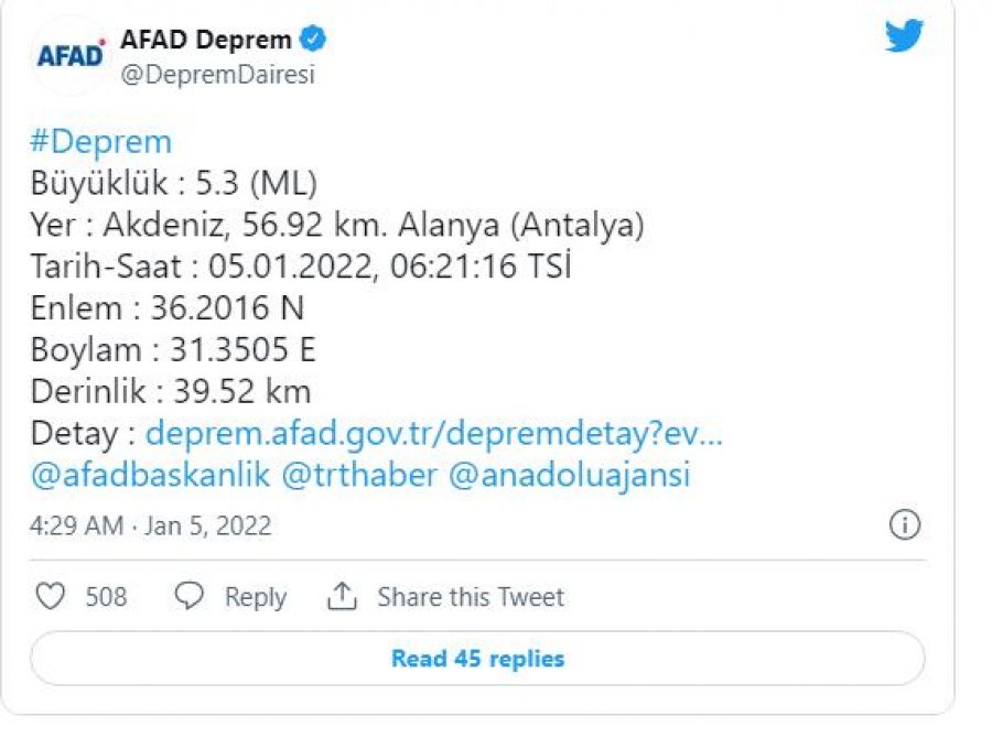Një tërmet me magnitudë 5.2 ballë të shkallës Rihter, goditi provincën turistike jugore të Antalisë mëngjesin e sotëm.