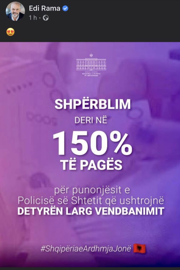 Kryeministri i vendit, Edi Rama ka premtuar ditën e sotme se do të shpërblejë me 150 % të rrogës punonjësit e Policisë që punojnë larg vendbanimit të tyre.