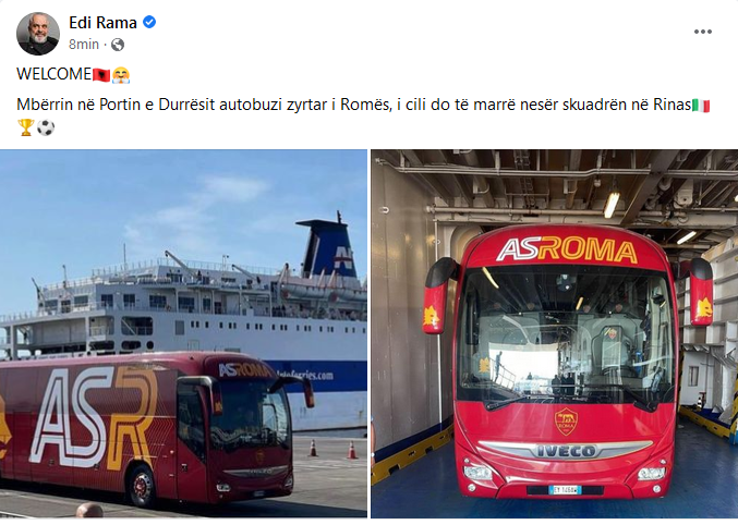 “Mbërrin në Portin e Durrësit autobuzi zyrtar i Romës, i cili do të marrë nesër skuadrën në Rinas”, shkruan Rama në një postim në faqen e tij zyrtare në Facebook.