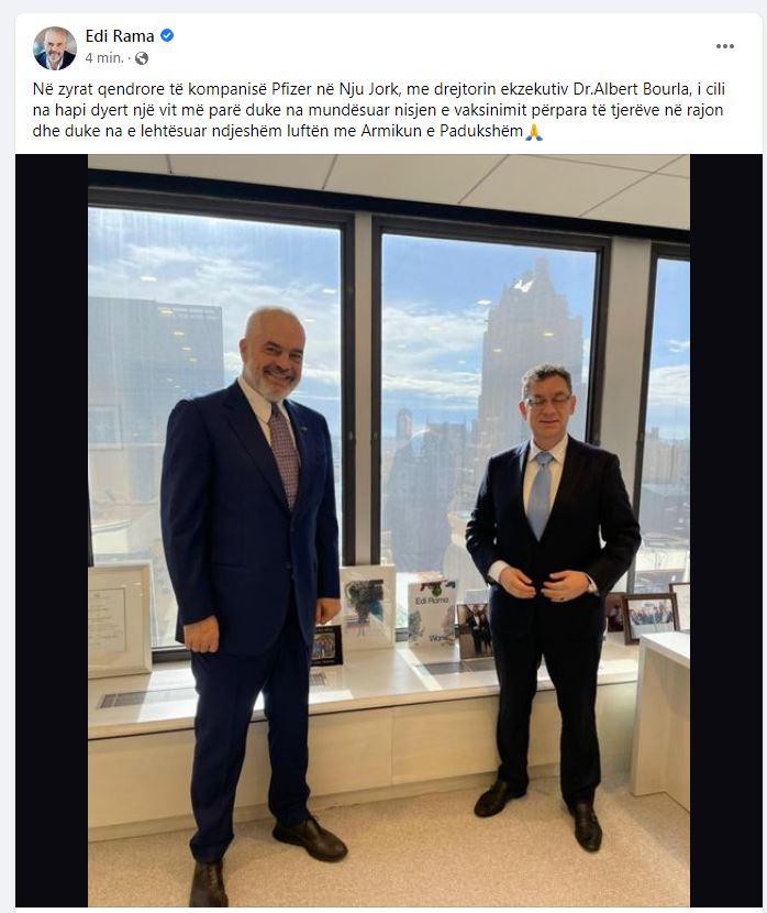“Në zyrat qendrore të kompanisë Pfizer në Nju Jork, me drejtorin ekzekutiv Dr.Albert Bourla, i cili na hapi dyert një vit më parë duke na mundësuar nisjen e vaksinimit përpara të tjerëve në rajon dhe duke na e lehtësuar ndjeshëm luftën me Armikun e Padukshëm”, shkruan Rama.