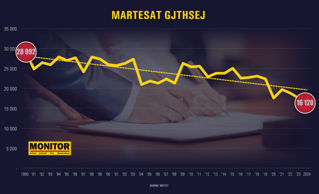 Nga rreth 29 mijë martesa në vitin 1990, niveli mbetet relativisht i qëndrueshëm gjatë viteve ’90 dhe fillimit të viteve 2000, me luhatje rreth 25–27 mijë në vit, përpara se të nisë një rënie strukturore pas vitit 2004.