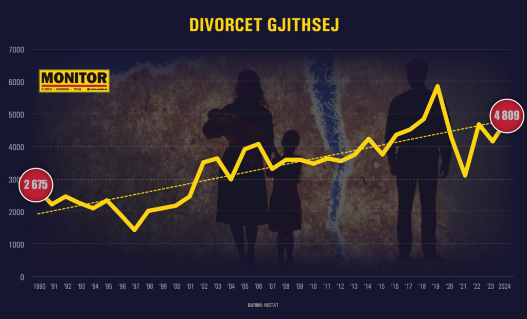 Sakaq edhe treguesi i divorceve për 1 000 martesa, i cili në vitin 1990 ishte 9.2, ka ndjekur një trajektore rritëse për më shumë se tri dekada, por vitet e fundit kanë thyer çdo rekord të mëparshëm.