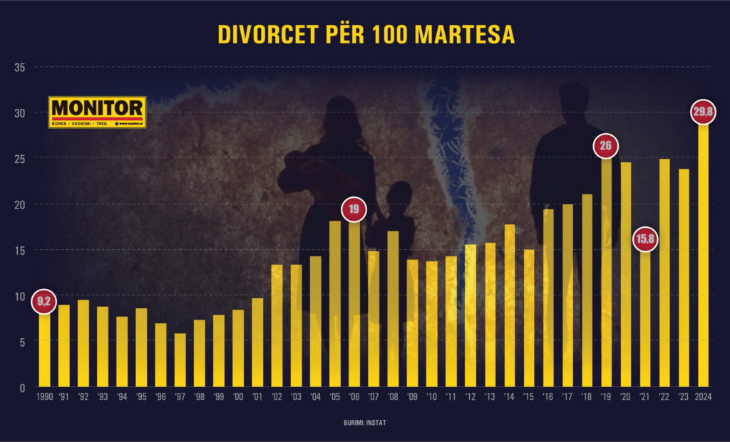 Nga fundi i viteve ’90, kur treguesi zbriti në minimumin historik prej 5.9 në vitin 1997, divorci nisi një ngjitje të pandalshme gjatë viteve 2000 dhe 2010, duke kaluar mbi 20 ndarje për 1 000 martesa që pas vitit 2018.Raportimi më i fundit tregon se viti 2024 shënon një rekord absolut prej 29.8 divorceve për 1 000 martesa, niveli më i lartë i regjistruar ndonjëherë në vend.