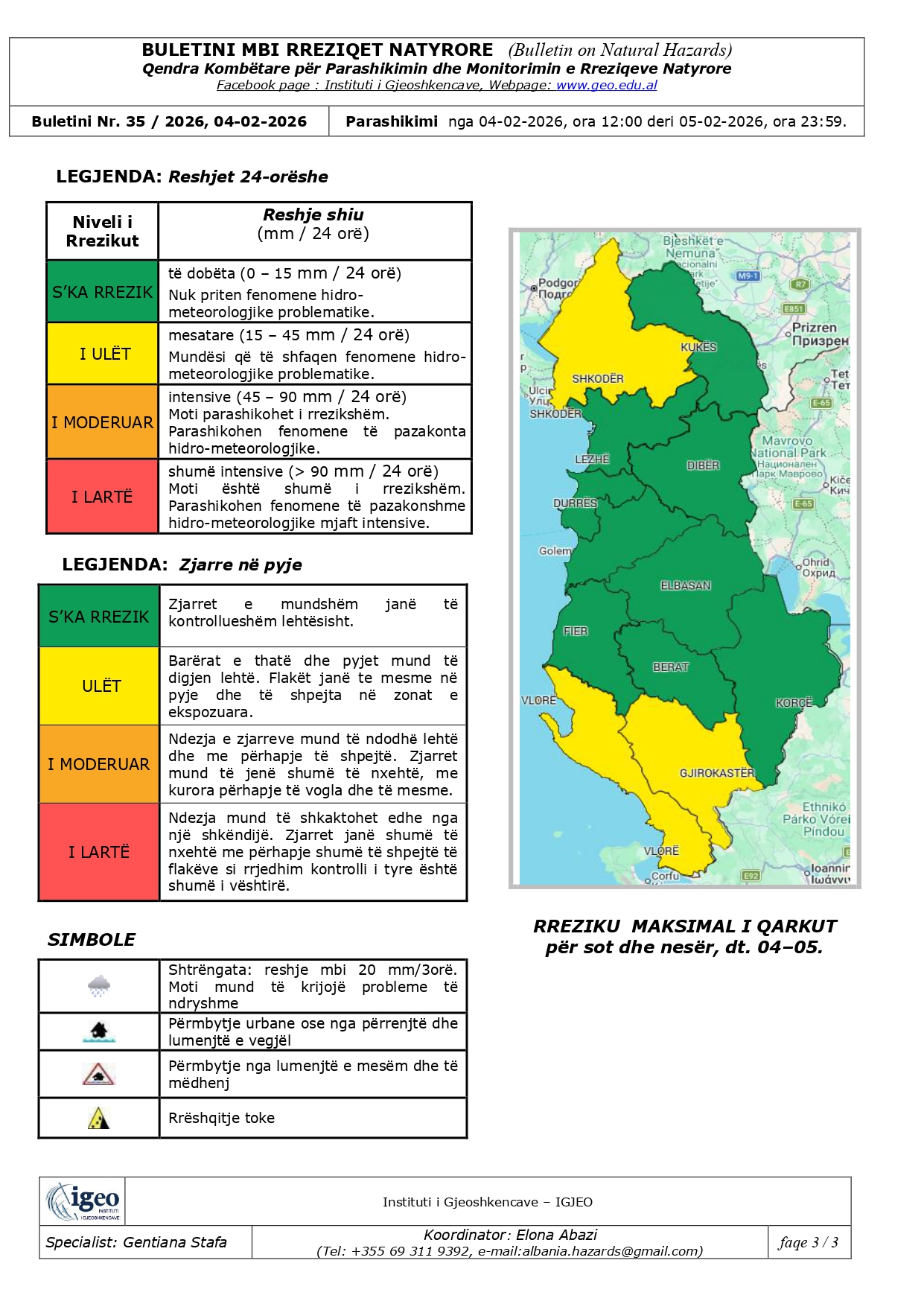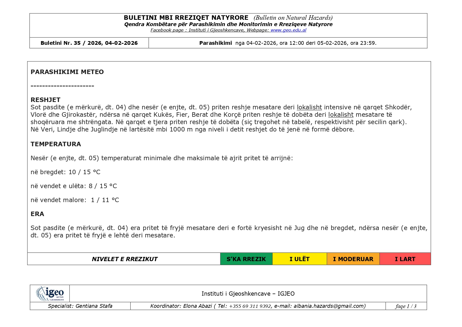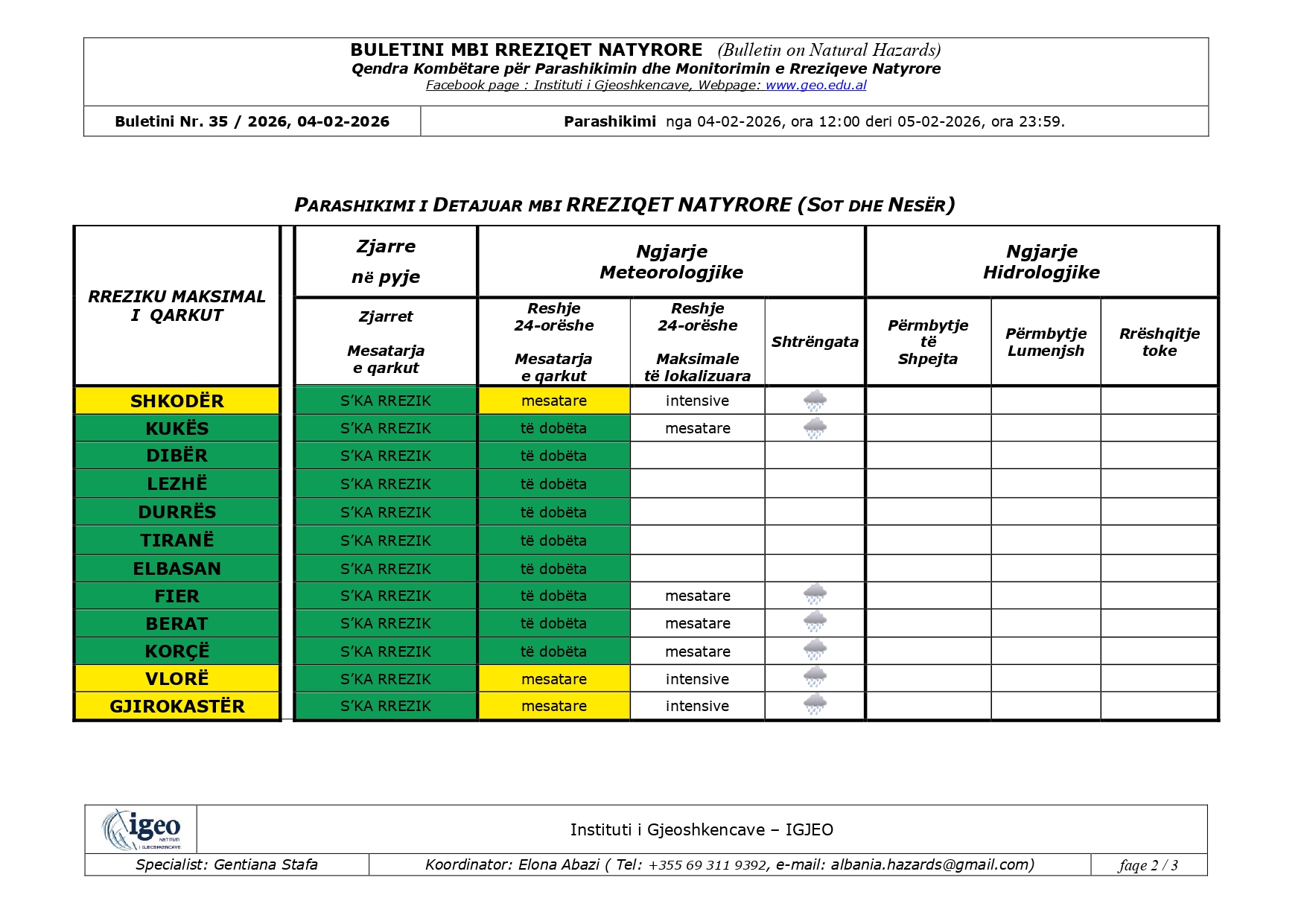 Pasdite e kësaj të mërkure dhe të enjtes, sipas Institutit të Gjeoshkencave, priten reshje mesatare deri lokalisht intensive në qarqet Shkodër, Vlorë dhe Gjirokastër, ndërsa në qarqet Kukës, Fier, Berat dhe Korçë priten reshje të dobëta deri lokalisht mesatare, të shoqëruara me shtrëngata. Sipas IGJEO, në 24 orët në vijim, reshje të dobëta priten edhe në qarqet e tjera.