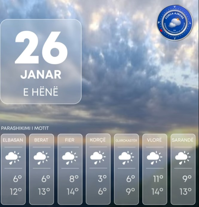 Moti parashikohet prej orëve të para të 24-orëshit deri në orët e mesditës me vranësira mesatare deri të dendura ndërsa pas orëve të mesditës mot me vranësira si dhe intervale të herëpashershme kthjellimesh kryesisht përgjatë ultësirës perëndimore. Reshjet e shiut priten të jenë prezente që në orët e para të 24-orëshit deri në orët e mesditës të herëpashershme me intensitet mesatar në pjesën më të madhe të vendit. Në periudha afatshkurtra këto reshje në formën e shtrëngatave.