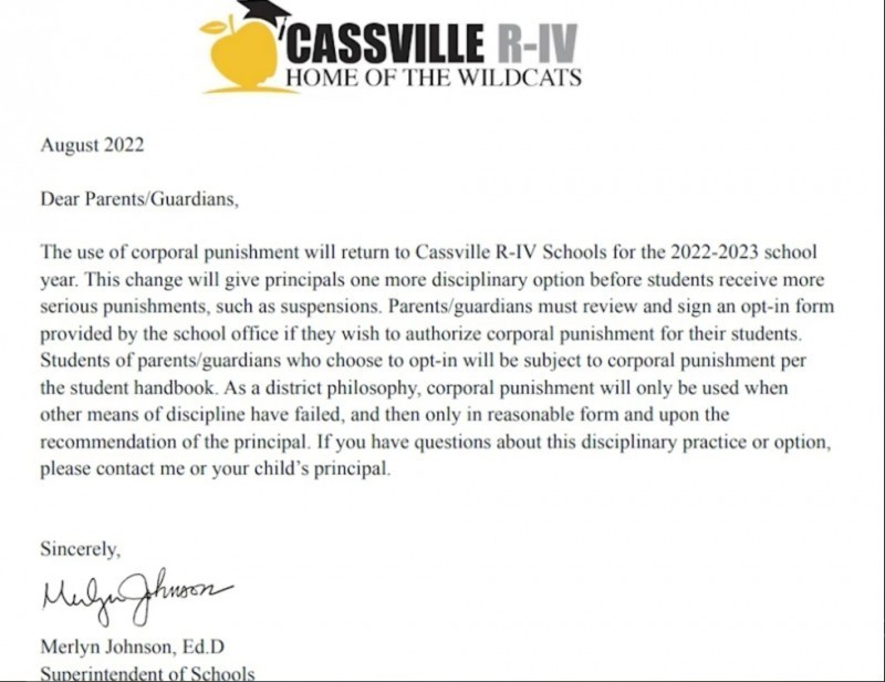 Në vitin shkollor 2022-2023, në shkollat e “Cassville R-IV” do të kthehet përdorimi i ndëshkimit trupor. Ky ndryshim do t’u japë drejtorëve një mundësi më shumë disiplinore, përpara se nxënësit të marrin dënime më të rënda, si pezullime etj. Prindërit dhe kujdestarët e studentëve duhet të shqyrtojnë dhe nënshkruajnë një formular të pranimit të ofruar nga zyra e shkollës, nëse dëshirojnë të autorizojnë ndëshkimin trupor për fëmijët e tyre. Nxënësit do t’i nënshtrohen ndëshkimit trupor sipas rregullave të politikave shkollore. Ndëshkimi trupor do të përdoret vetëm kur mjetet e tjera të disiplinës kanë dështuar, si dhe me rekomandimin e drejtorit. Nëse keni pyetje në lidhje me këtë praktikë ose opsion disiplinor, ju lutemi më kontaktoni mua ose drejtorin e fëmijës tuaj.