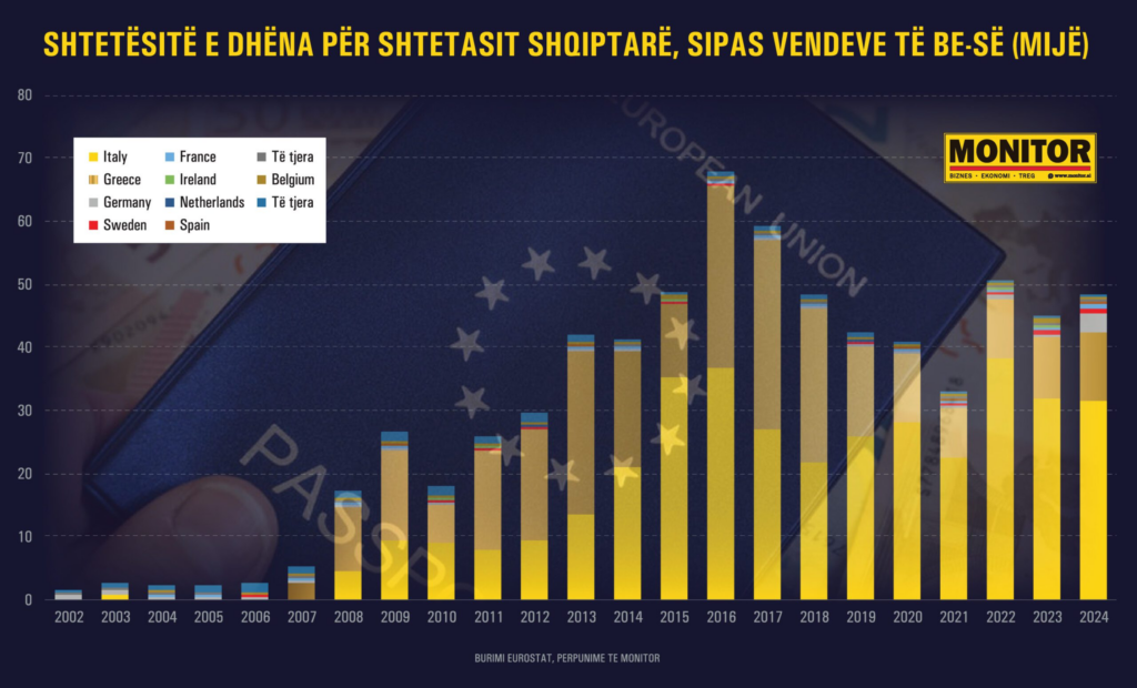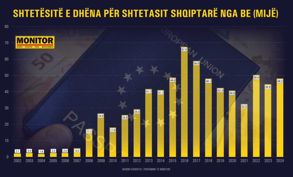 Që nga viti 2010, rreth 632 mijë shqiptarë kanë marrë pasaportë në një nga vendet e BE-së, ndërsa vetëm dekadën e fundit janë dhënë 522 mijë shtetësi. (shiko grafikun: Shtetësitë e dhëna për shtetasit shqiptarë nga BE). Niveli më i lartë ishte në 2016 dhe 2016, me rreth 60-67 mijë në vit.