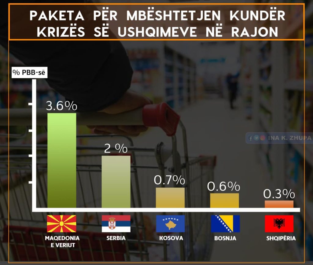 Vetëm 0.3% të GDP-së ofroi Shqipëria si mbështetje për krizën ekonomike që prekën kryesisht nevojat bazë sidomos ushqimet. Vendet e tjera të rajonit japin më shumë për qytetarët e tyre siç e tregon edhe tabela👇🏻