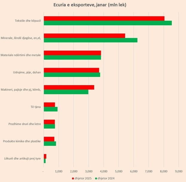 Kjo mbyllje është reflektuar dhe në rënien e eksporteve të tekstileve e këpucëve në muajin e parë të këtij viti. Ky sektor shiti 8 miliardë lekë në janar 2026, me rënie prej 5.8% në krahasim me të njëjtën periudhë të një viti më parë.