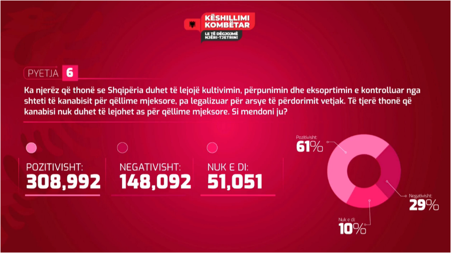 61 % e personave që kanë plotësuar formularët e Këshillimit Kombëtar i janë përgjigjur pozitisht pyetjes Shqipëria duhet të lejojë kultivimin, përpunimin dhe eksportimin e kontrolluar nga shteti të kanabisit.