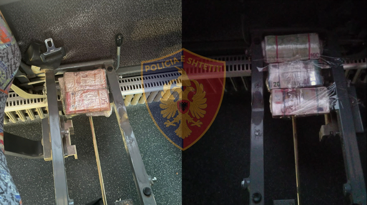 Gjatë kontrollit në autobus, poshtë 2 sediljeve, u gjetën të ngjitura me natriban 67 460 euro.