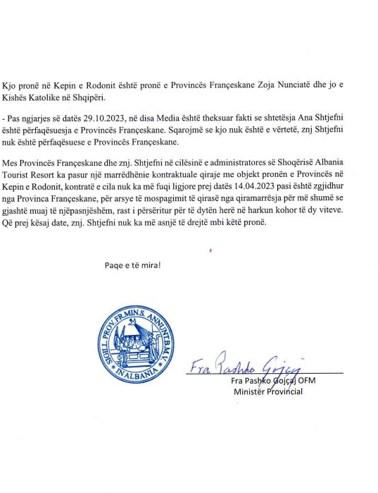 Sakaq, në deklaratë theksohet se prona në Kepin e Rodonit është pronë e Provincës Françeskane dhe jo e Kishës Katolike në Shqipëri.