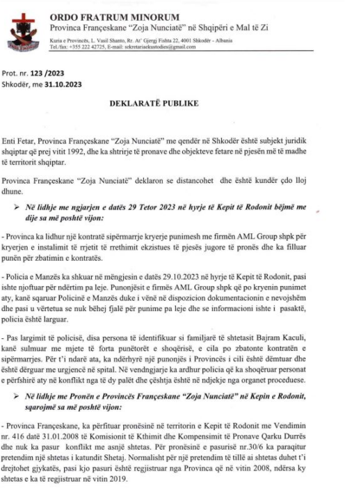 Përmes një deklarate publike, Provinca Françeskane thotë se ka fituar pronësinë në territorin e Kepit të Rodonit me vendim dhe nuk ka pasur asnjë konflikt me asnjë shtetas.
