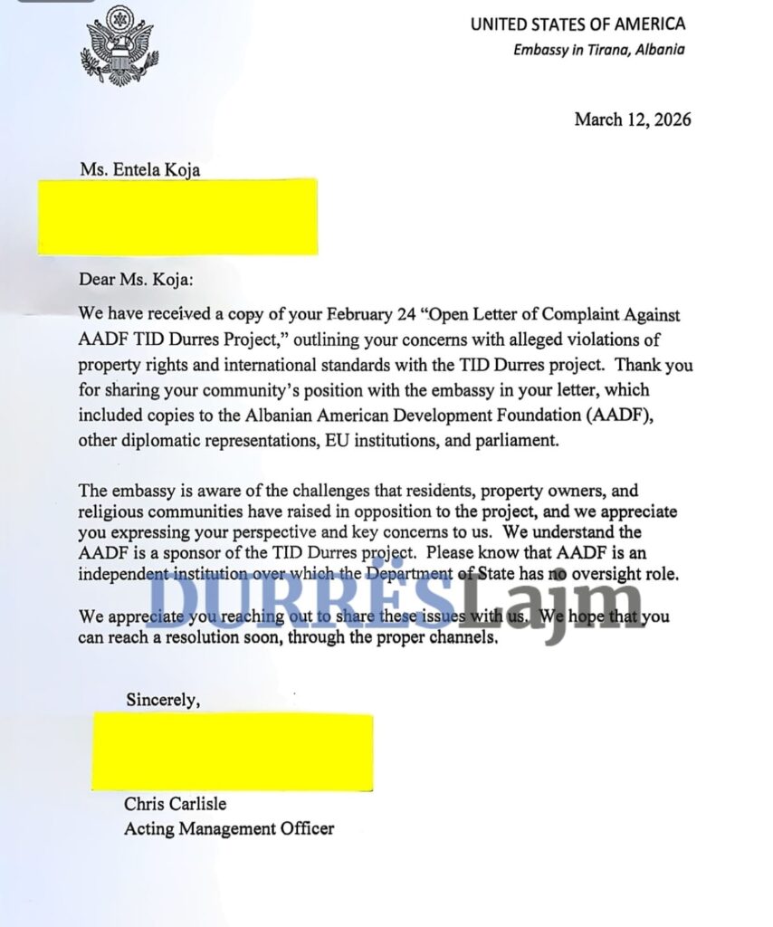 Për të marrë një përgjigje lidhur me zhvillimet më të fundit lidhur me projektin TID Durrës, “DurrësLajm” zhvilloi një bisedë telefonike me anëtaren e kryesisë së Grupimit Qytetar kundër Projektit TID Durrës, arkitekten Entella Koja, e cila na zbuloi gjatë bashkëbisedimit një pëtgjigje të sapombërritur nga Ambasada e SHBA-së në vendin tonë, të cilën po e publikojmë më poshtë: