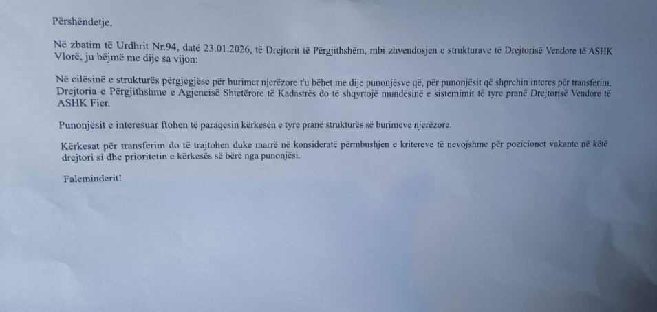 Në këtë situatë të krijuar, Drejtoria e Përgjithshme e Kadastrës, ASHK, ka bërë një njoftim për punonjësit që të dërgojnë kërkesat nëse duan të transferohen me punë në Drejtorinë e Kadastrës Fier.