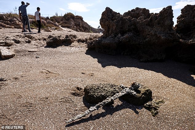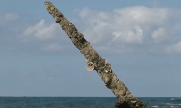 E mbështjellë plotësisht nga guaska dhe organizma të tjerë detarë, shpata një metër e gjatë u dallua për shkak të rrymave të forta që kishin larguar rërën me të cilën kishte qëndruar e mbuluar për një kohë të gjatë.