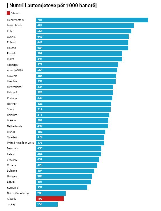 Me këtë shifër, Shqipëria është larg vendeve më pak të motorizuara të BE-së dhe e parafundit në Europë, duke ia kaluar vetëm Turqia (150 mjete për 1000 banorë). Maqedonia e Veriut kishte 205 mjete për 1000 banorë. Të dhënat për Kosovën janë për vitin 2017, dhe ky tregues për atë vit ishte më pak sesa 100.