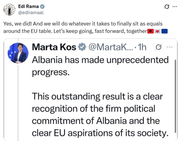 Kreu i qeverisë në ndarë në një postim në X, deklaratën e Komisioneres së BE për Zgjerimin, Marta Kos e cila vlerësoi përparimin që ka bërë Shqipëria.