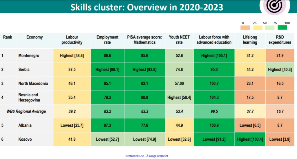 Rajoni i Ballkanit Perëndimor, përfshirë Shqipërinë, regjistron një produktivitet pune që mbetet ndjeshëm më i ulët se ai i BE-së. Indikatori i produktivitetit të punës ne Rajon arrin vetëm rreth 40% të nivelit mesatar evropian, duke reflektuar sfida strukturore dhe dobësi në aftësitë praktike të punonjësve, por Shqipëria renditet shumë keq në raport me rajonin.
