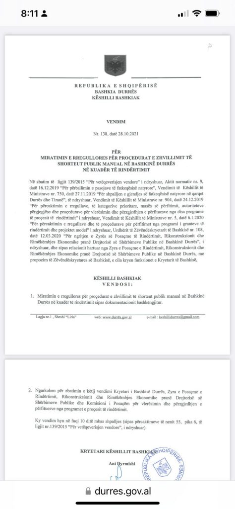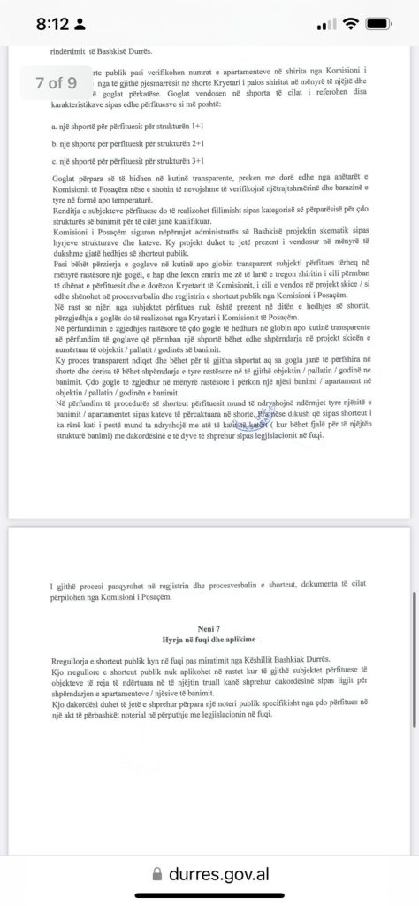 Në mungesë transparence të plotë Bashkia Durrës, me qëllim dhe me dashje, shkeli ligjin që vetë e ka miratuar e konkretisht nè rregulloren e miratuar me Vendimin e Kèshillit Bashkiak Nr.138 date 28.10.2021 për mbajtjen e shorteut publik.