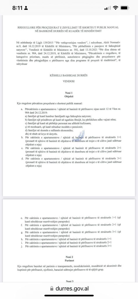 Kjo rregullore bazohet nè parimin e transparencès, mosdiskriminit, mundèsisè sè aksesimit dhe kuptimit pèr pèrfituesit, njoftimit, barazisè ndermjet pèrfituesve tè tè njejtit grup. Rezultatet e shorteut si më poshtë tregojnë se si shtëpitë e qytetarëve u grabitën nga tarafi i bashkisë.