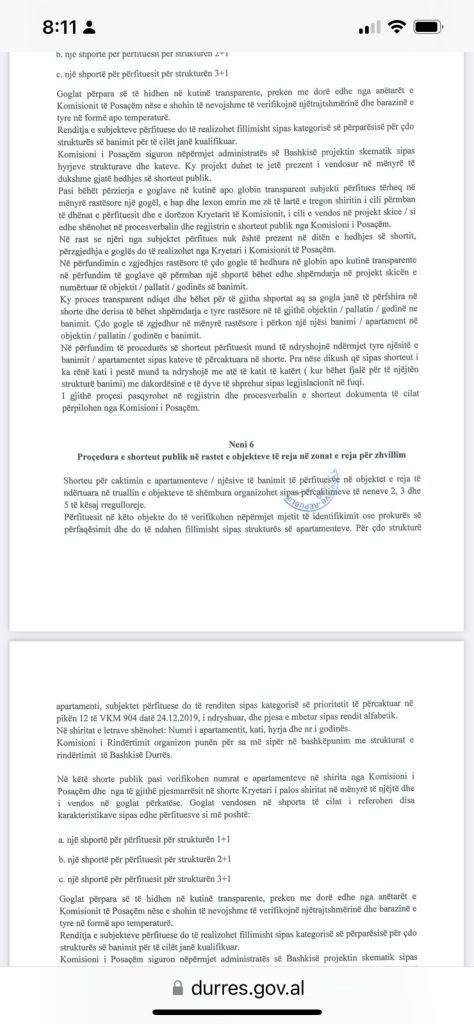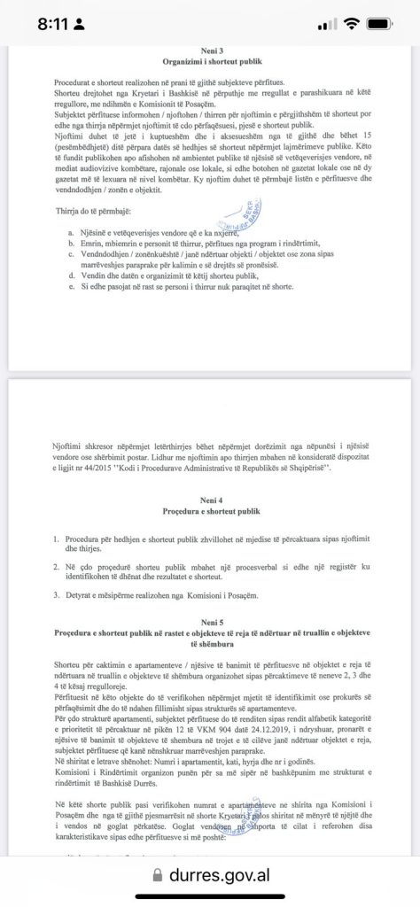 Sepse vetëm transparencë nuk u pa në këtë shorte. Kur qytetarët hynë të emocionuar e me shumë dilema pasi donin t’i ndanin apartamentet me parimin “në katet ku i kanë blerë, “dhe me detyrim i sollën në shorte. Nëse qytetarët nuk mernin pjesë në shorte bashkia në thirrjen publike thoshte se humbasin të drejtën e ankimit. https://www.durres.gov.al/bashkia/njoftime-shpallje/1663-njoftim-per-shorteun-publik-te-dates-17-06-2022-me-objekt-shperndarjen-caktimin-midis-perfituesve-nga-procesi-i-rindertimit-te-baneses-kolektive-me-nr-1062-rruga-26-nentori.