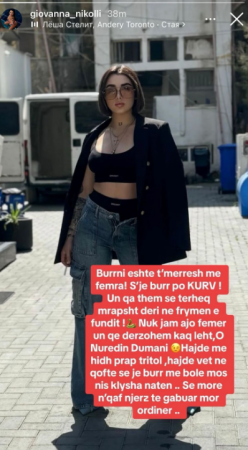 “Burrni është t’merresh me femra! S’je burr po KURV ! Un qa them se terheq mrapsht deri ne frymen e fundit! Nuk jam ajo femer un qe derzohem kaq leht, O Nuredin Dumani Hajde me hidh prap tritol, hajde vet ne qofte se je burr me bo*e mos nis klysha naten .. Se more n’qaf njerz te gabuar mor ordiner ..”, shkruan ajo.